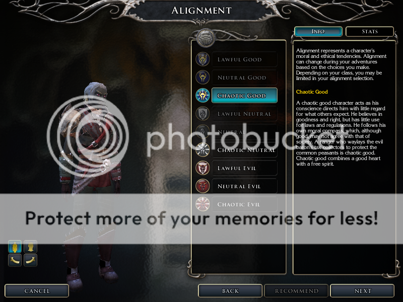 Selecting an alignment.  This can be an extremely confusing part for newcomers in the D&D universe.  The first half is your character's attitude toward law - Lawful, Neutral, or Chaotic.  A Lawful person will rarely (it ever) do anything outside the law, even if it means blindly following authority.  A Chaotic person will completely disregard the law (this does not in any way signify that they are "bad" people - perhaps they ignore the law because they feel that the laws enforced upon their society or corrupt or irrelevant).  A Neutral person follows the law comfortably, but recognizes a bogus rule when he sees one.  The second half of the alignment describes the character's personality - Good, Neutral, or Evil.  A Good person goes out of their way to help people, an Evil person delberately causes suffering, and a Neutral person will see both sides of any conflict.  For my character, I have selected Chaotic Good, so he will act upon his conscience (ignoring the law if need be) to help others.  As you can see here, not all of the alignments are available for me to select.  Some races and classes state that certain alignments are off-limits.  The character I made before this is a Druid, and her class requires that she must retain some form of Neutrality, in order to be in balance with the ways of nature and tree-hugging.