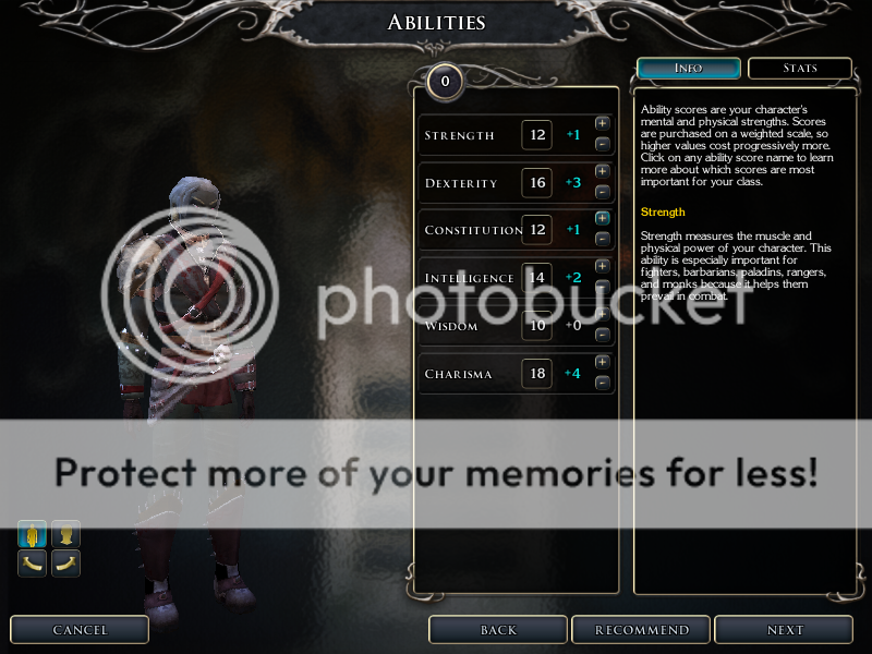 Assigning you ability scores is pretty straightforward.  The blue numbers to the right is how much advancing each ability will cost.  Since Warlocks derive their magical power through Charisma (unlike Wizards, whose power comes from Intelligence; or Druids, whose power comes from Wisdom), I have to make sure that it is one of the highest-ranked abilities here.  The game does a good job describing each of the abilities, so I won't go into that here, but the difference between Wisdom and Intelligence can be confusing if you've never encountered D&D before.  So, make sure you really understand what the difference is before assigning your ability scores at this point, either by reading the description on the right-hand side of the screen or reviewing that chapter in the instruction manual (which is probably the more informative between the two).  A good idea for this part is clicking the "Recommend" button at the bottom, which will disperse your ability scores in the default manner depending on your class.  Of course, you're free to tweak the scores as much as you'd like.