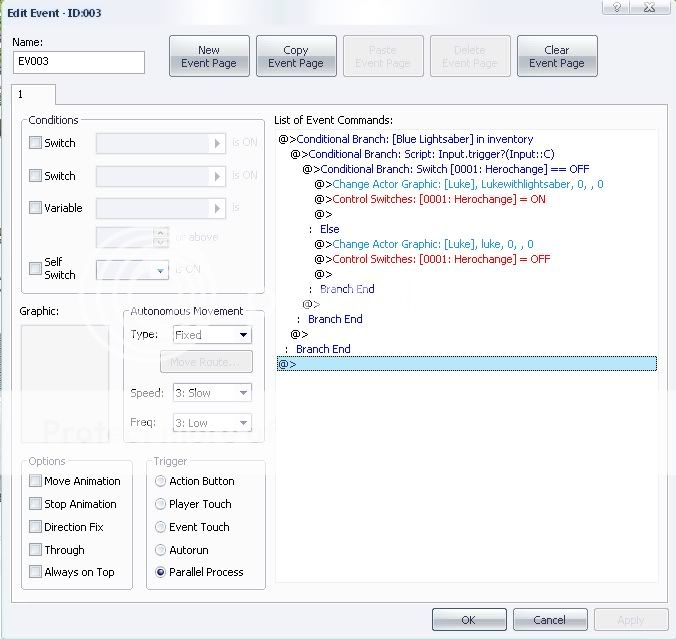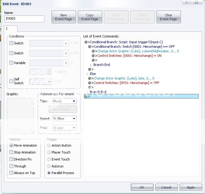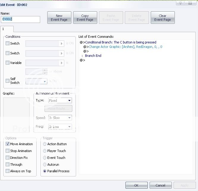 geeze, sorry to bother you again, but I sill cant get it...I really SUCK with events...So I added that, but this time when the games starts he is already the new grafic, and switches back in a second, and C does nothing....this should all be under a event page right? and set to parallel process?